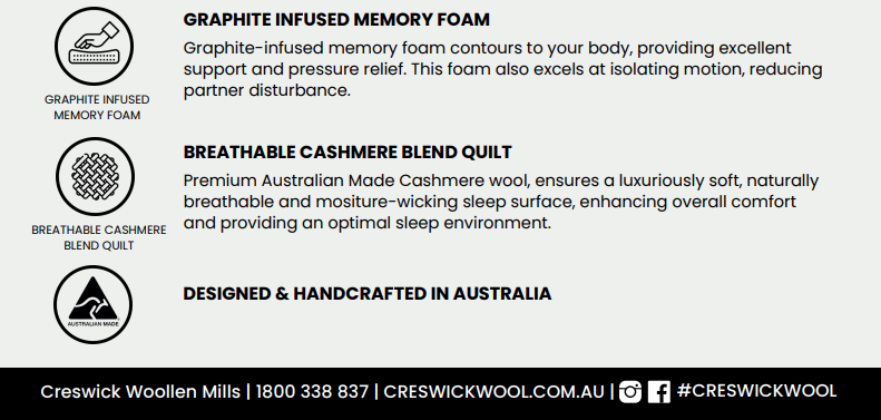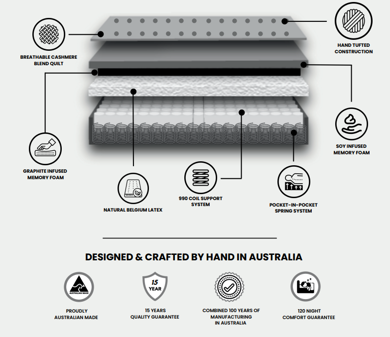Expertly crafted with premium natural materials - including Belgium latex, graphite-infused memory foam and the additional layer of soy-infused natural memory foam - each layer in this unique mattress combines indulgence and unparalleled softness all wrapped up in the most sumptuous layer of Australian Made Cashmere Wool.