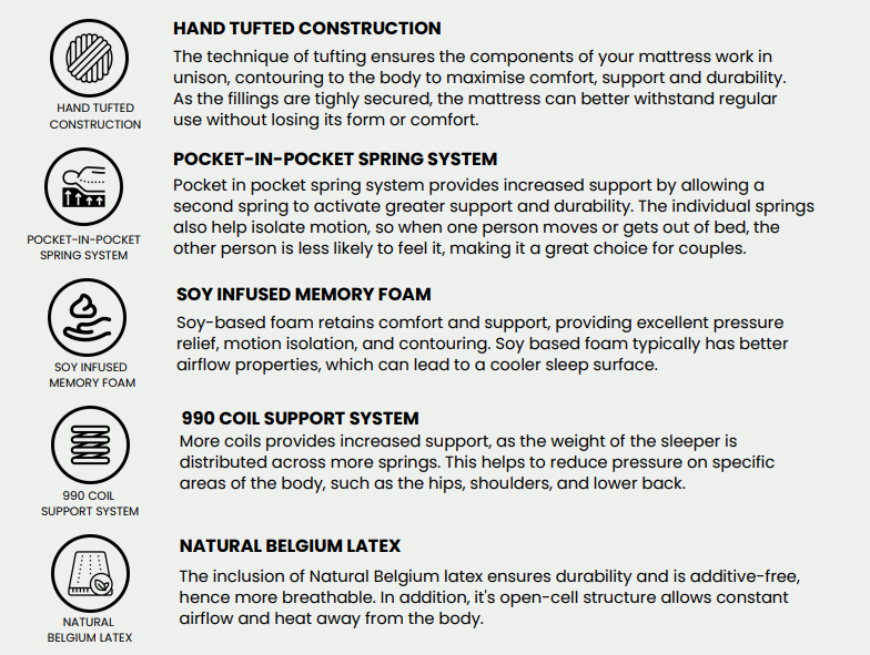 Traditionally hand tufted and designed with advanced 990 pocket-in pocket coil spring system that contours seamlessly to your body for exceptional comfort and support.